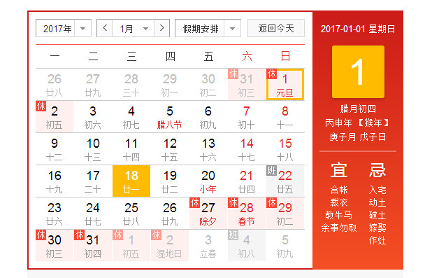 春节放假时间:2017/1/25(星期三)--2017/2/2(星期四)。